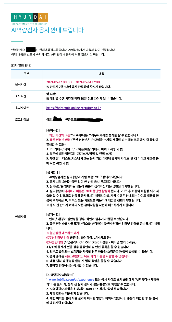 현대백화점 그룹은 타 대기업과 유사하게 자사만의 인적성을 진행했으나, 최근 들어 온라인 AI 역량평가로 대체한다고 알고 있다. 국내 대기업의 AI 역량검사를 대행하는 미다스 IT의 역량검사와 동일하며 어느 정도 포맷이 정해져 있다는 후기가 많아 준비하는 데에 많은 어려움이 있지는 않은 단계이다.