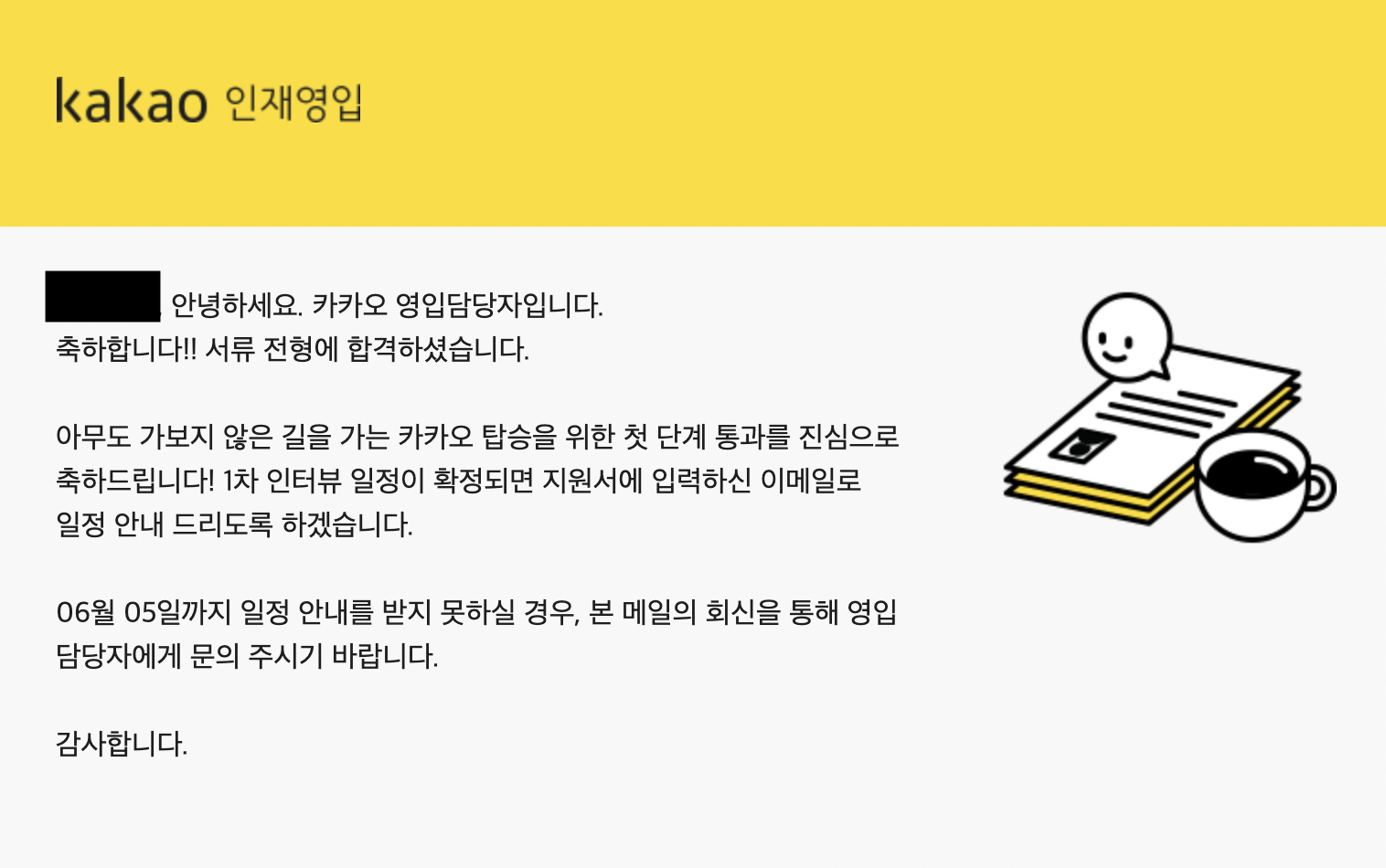 카카오 인턴십은 전형이 매우 간단한 편이다. 복잡한 인적성이나, 이상한 자기소개서 문항이 있지도 않고 깔끔하게 구성되어있다. 특히 인턴십 기회를 얻기까지 [서류전형, 1차 면접] 이렇게 두 단계밖에 없다는 점이 취준생 입장에서는 부담을 많이 덜 수 있어서 좋았다.