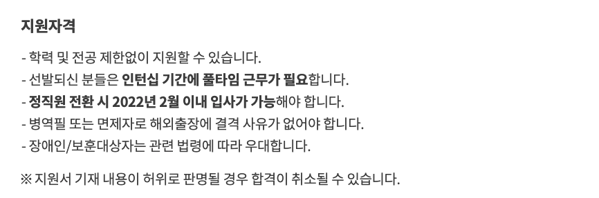지원자격은 굉장히 마일드한편이다. 특히 '블라인드'는 아니나 학력이나 전공 제한 없이 지원 가능하다는 점이 특이점이었다. (Biz & Service의 경우 특히 회계/재무와 같은 전공적 강점이 드러나는 직무가 아닌 포지션 채용이 많기 때문에 이렇게 진행하는 듯하다.)