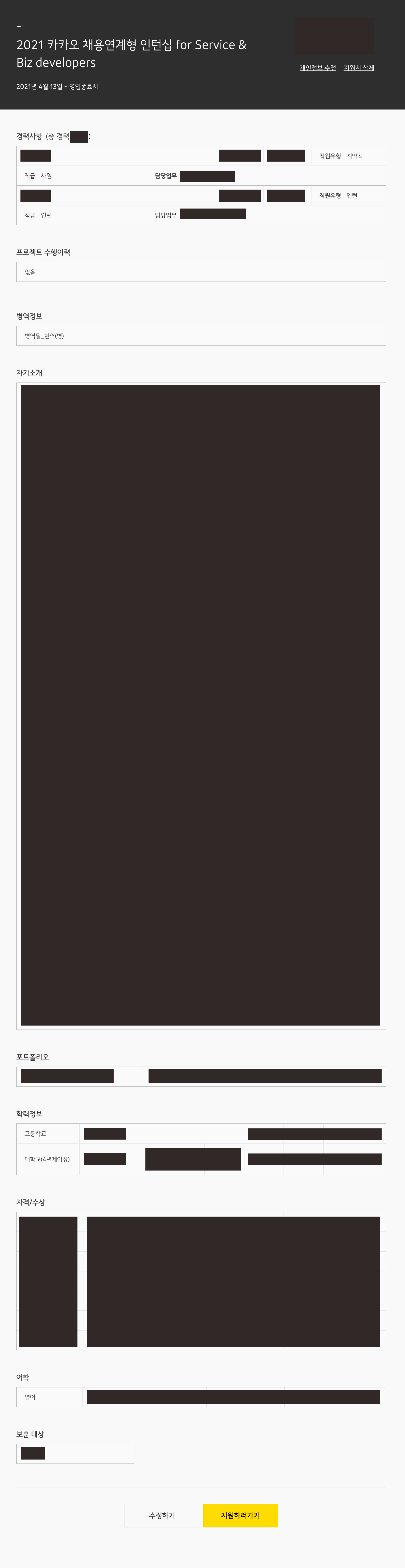 인턴/사원 경력은 있으나 명확하게 '연관되어서' 어필할만한 프로젝트가 있지 않다고 판단해 프로젝트 수행이력은 공란으로 남겨두었다.