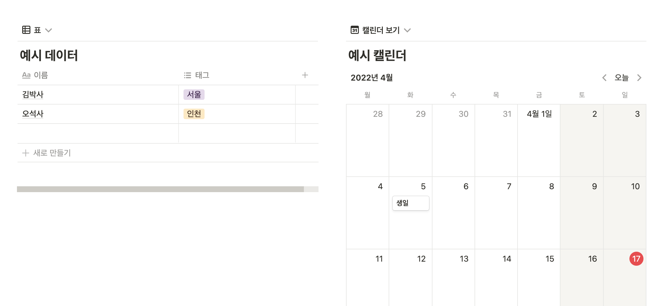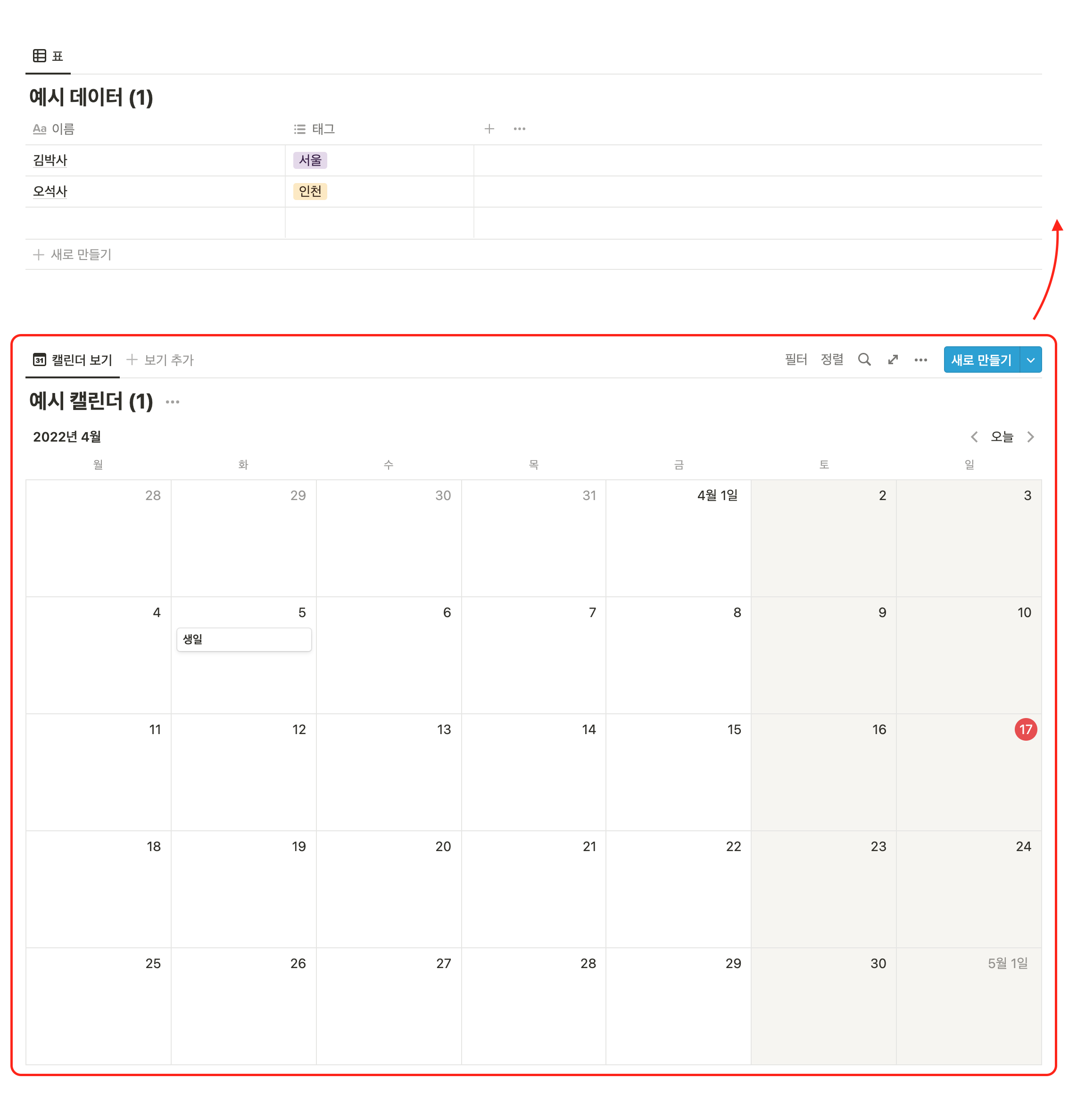 그럼 아래처럼 "표", "캘린더"가 아니라 "페이지"로 전환됩니다.