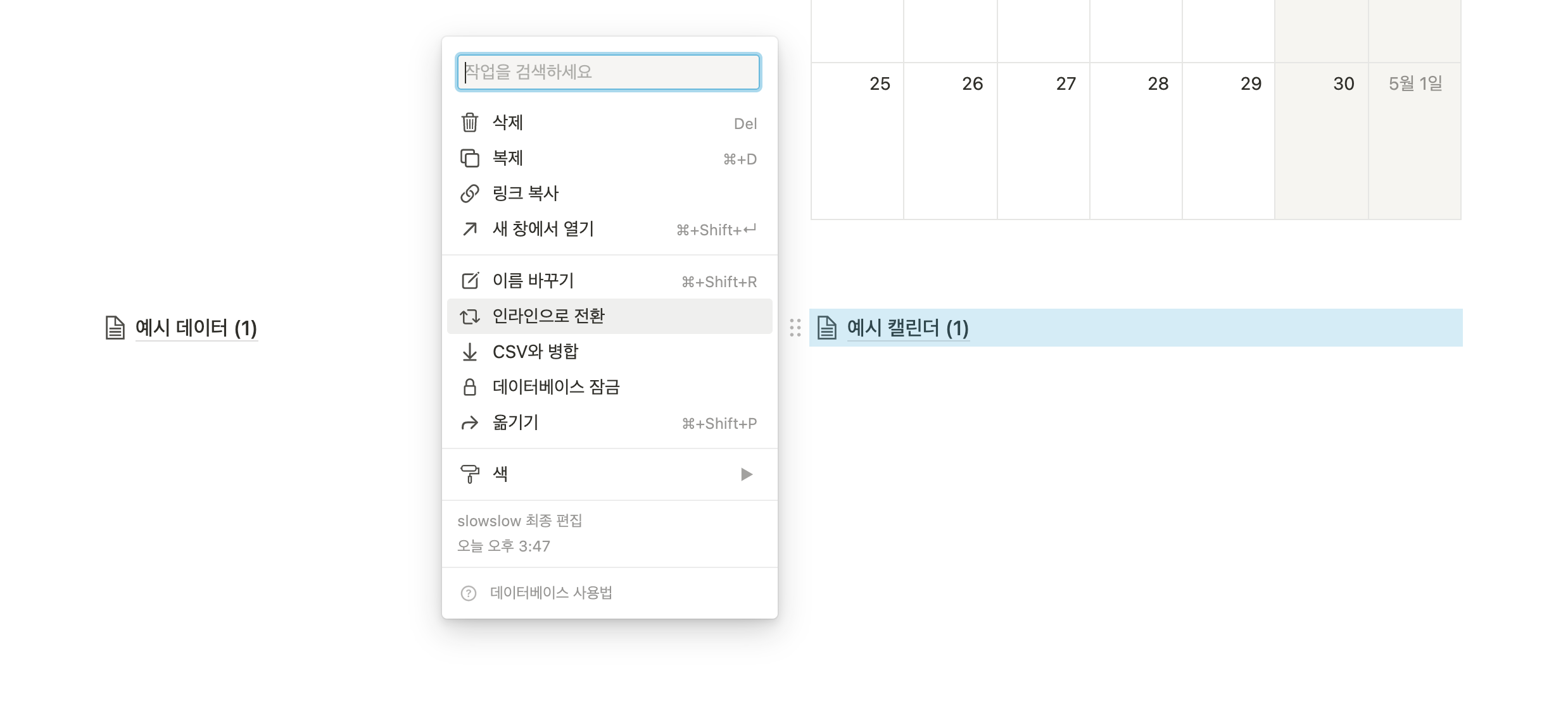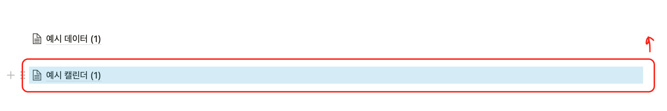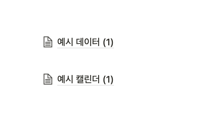 붉은색 박스인 예시 캘린더(1)를 잡고 예시 데이터(1)의 우측에 밀어 넣으려고 하면, 아예 동작하지 않습니다.