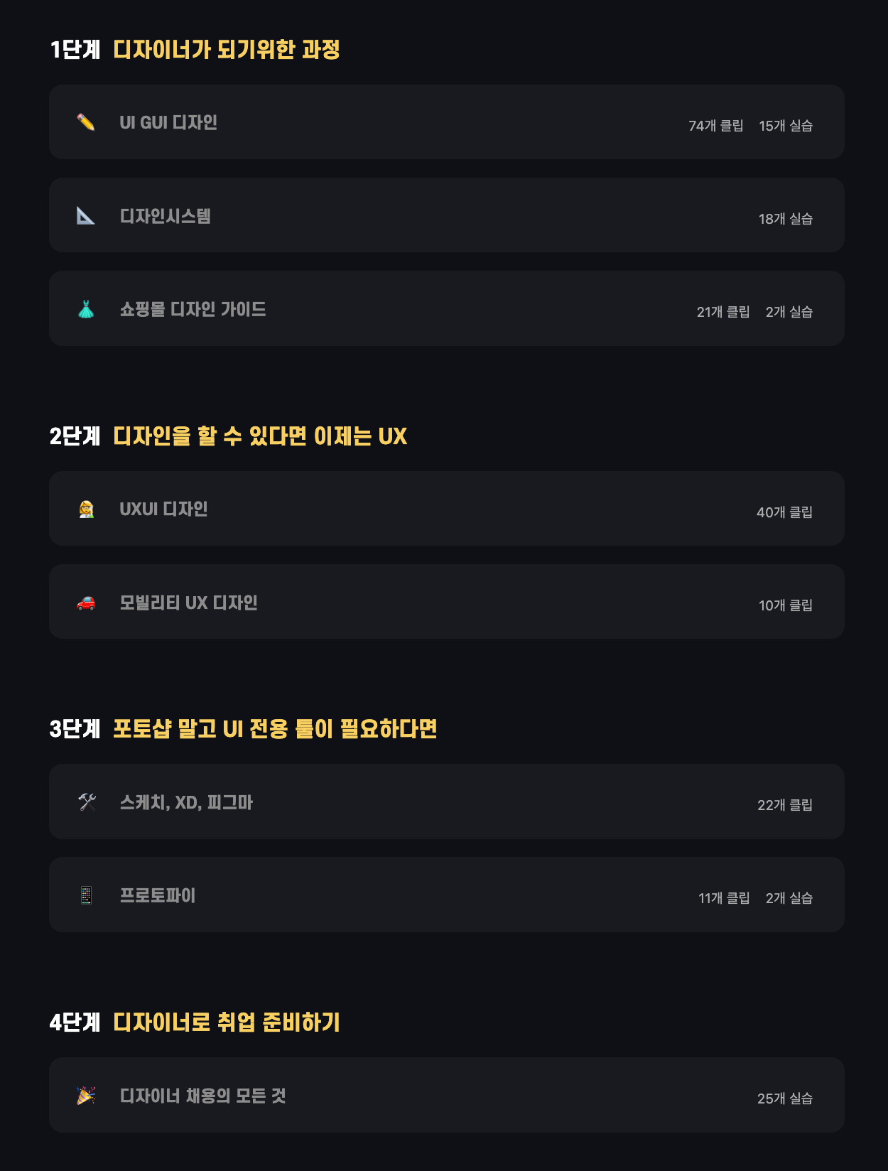 - 스케치, XD, 피그마 등 다양한 디자인 툴에 대해서 한 번에 다루면서 해당툴에 대한 전문적인 내용은 다루지 못하고 있음.