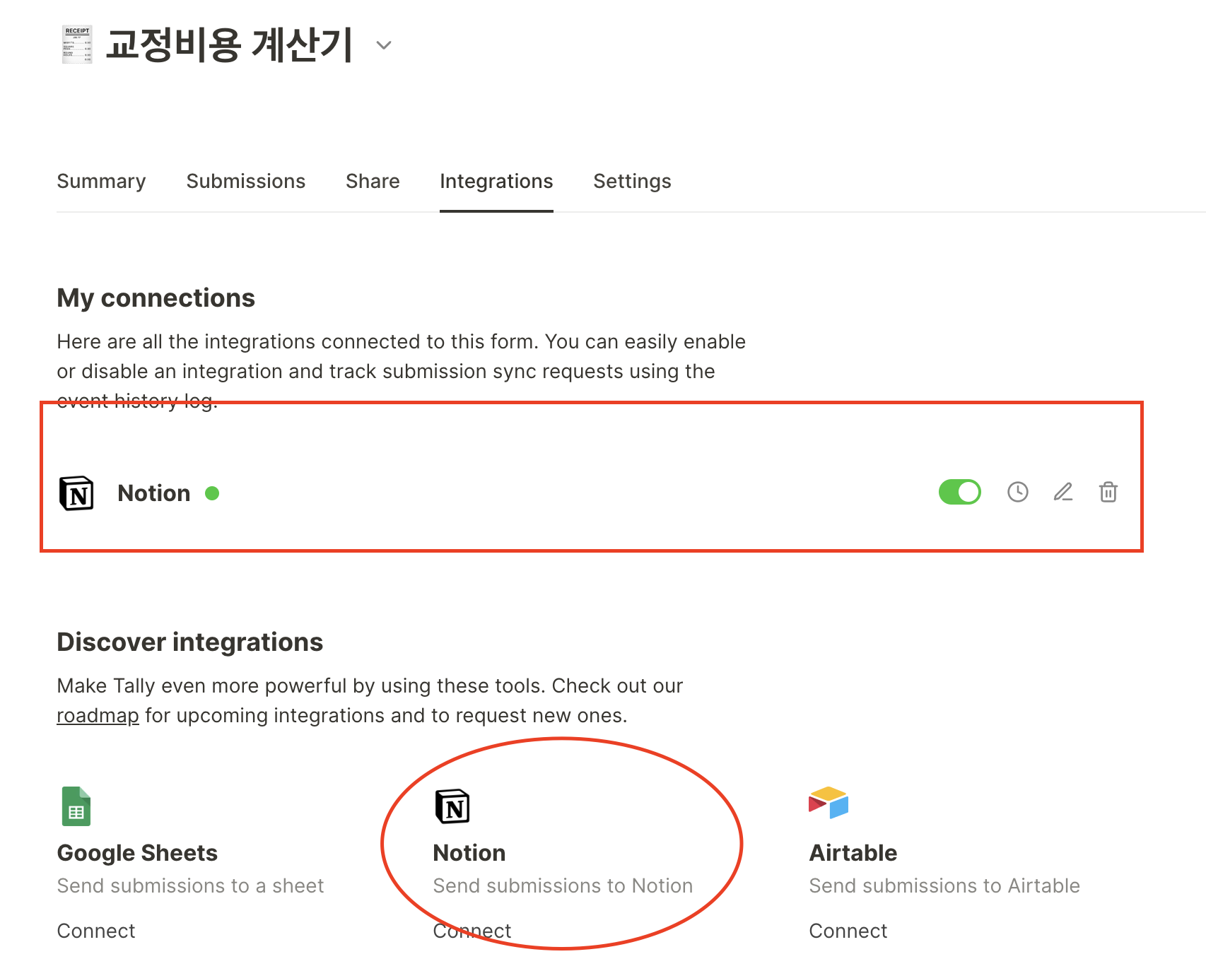 - 비용정보를 공유하면, Tally의 인테그레이션 기능을 활용하여, 즉시 노션 데이터베이스에 반영됩니다.
