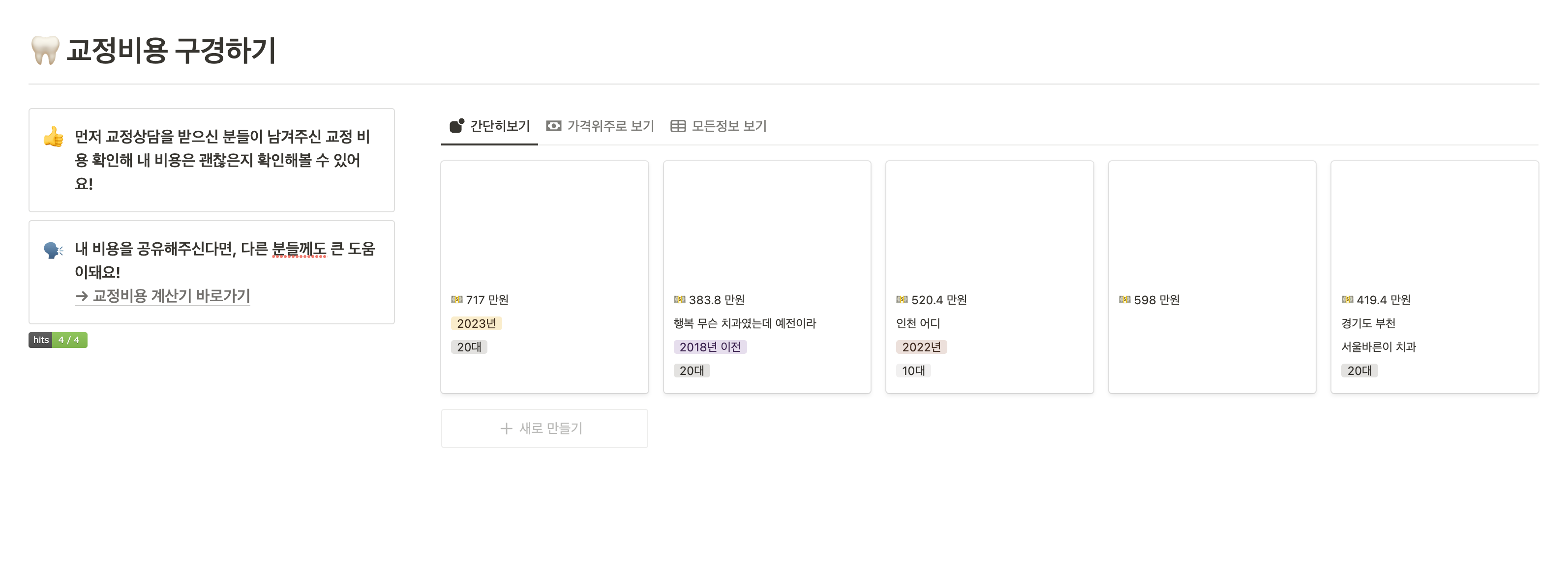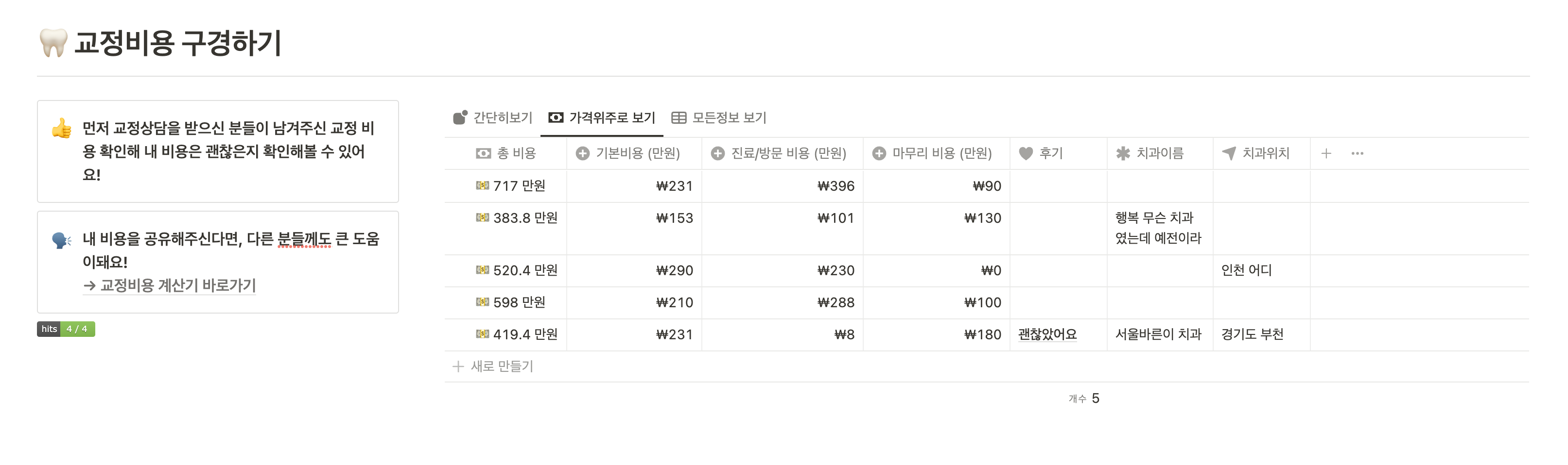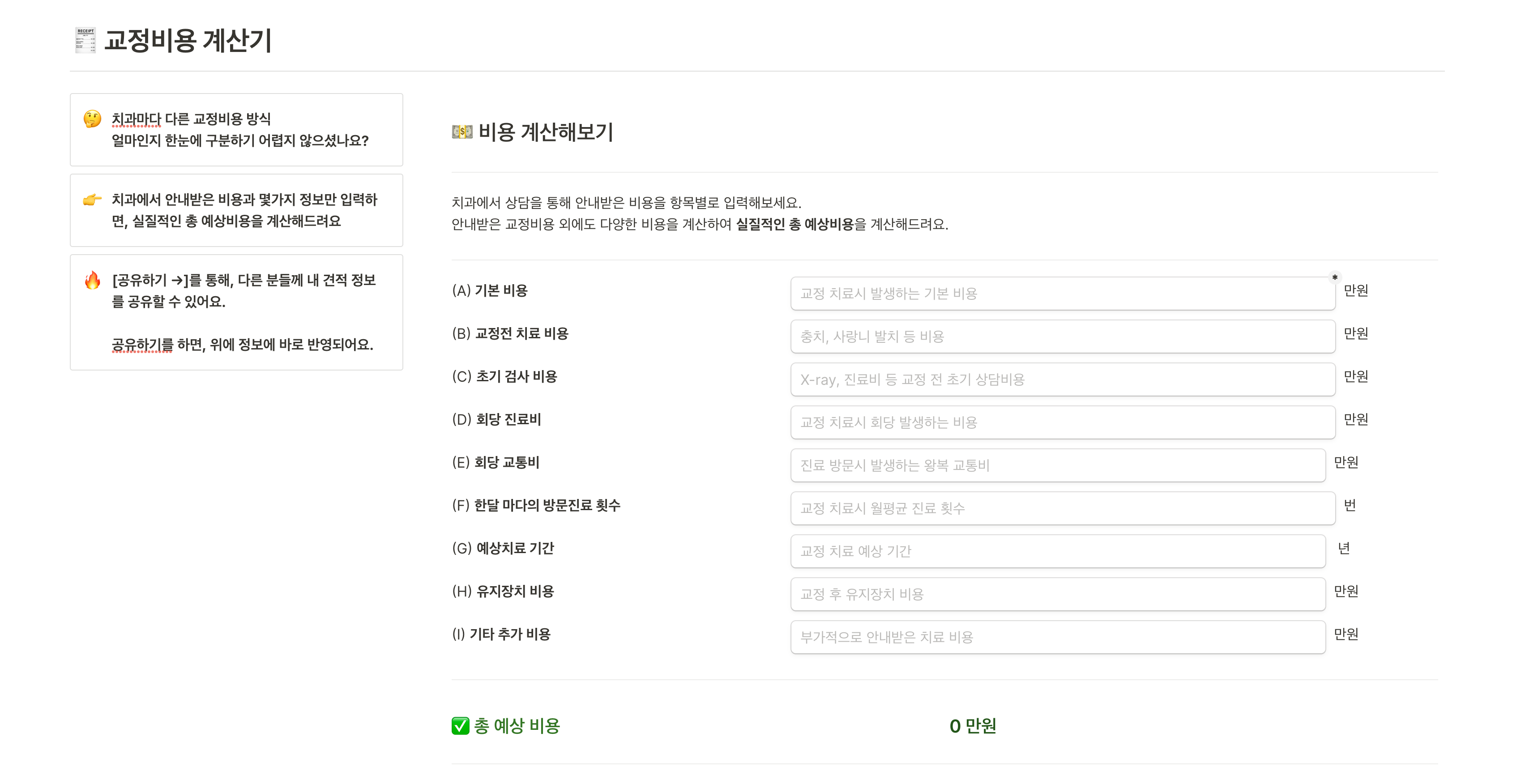 - 병원별 교정비용 계산로직을 어딘가에서 수집해서 공개한다.
