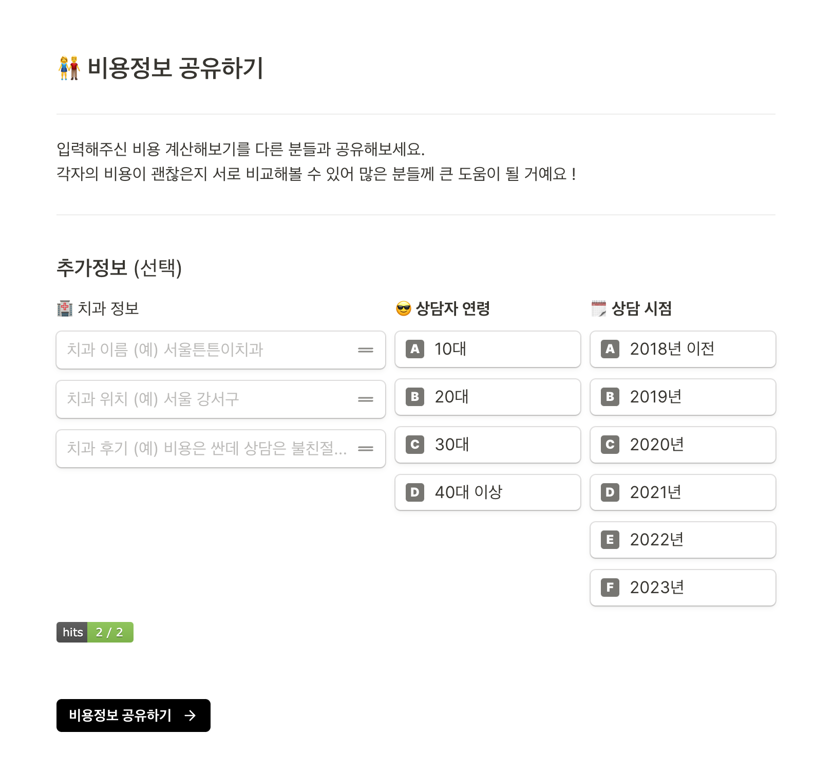 - 결과금액을 조회한 후, 하단에서 선택적으로 비용정보를 공유할 수 있습니다. 보다 도움이 되는 정보가 될 수 있게 선택적으로 상담자의 정보나 병원의 정보를 입력할 수 있도록 하였습니다.