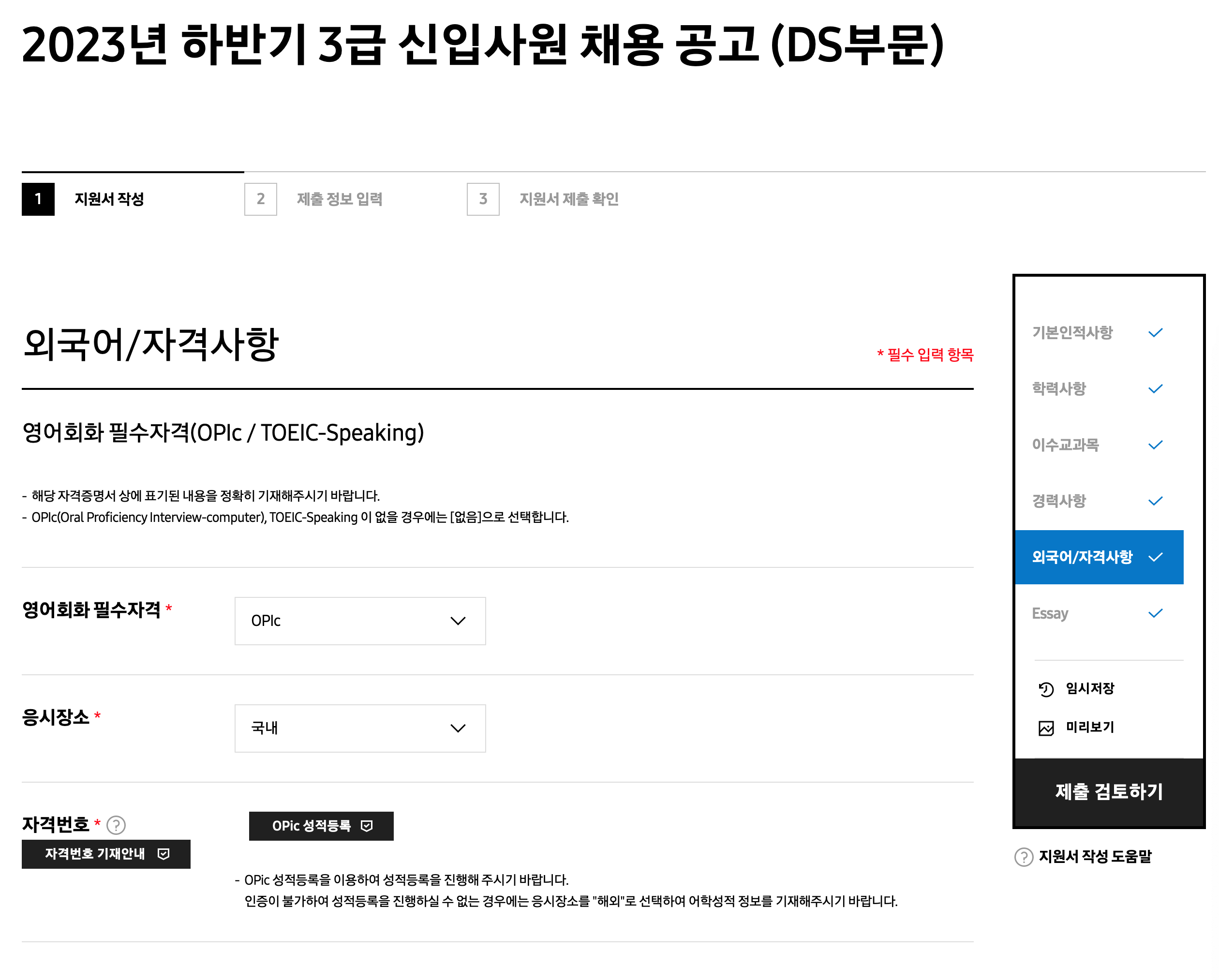 두 번째는 삼성 그룹사 채용 페이지를 활용하는 것입니다. 삼성 그룹 채용 페이지에서 오픽시험을 선택하고 결과 정보 보기를 누르는 방식인데요. 과거에는 이를 통해서 삼성에 응시하지 않아도 오픽이 결과를 미리 확인할 수 있었다고 하나, 현재는 작동하지 않습니다. 결과보기를 클릭할 경우, 결과가 발표된 OPIc 시험 응시 내용만 공개되도록 되어 있어 아직 결과가 발표되지 않은 건들은 결과를 확인할 수 없습니다