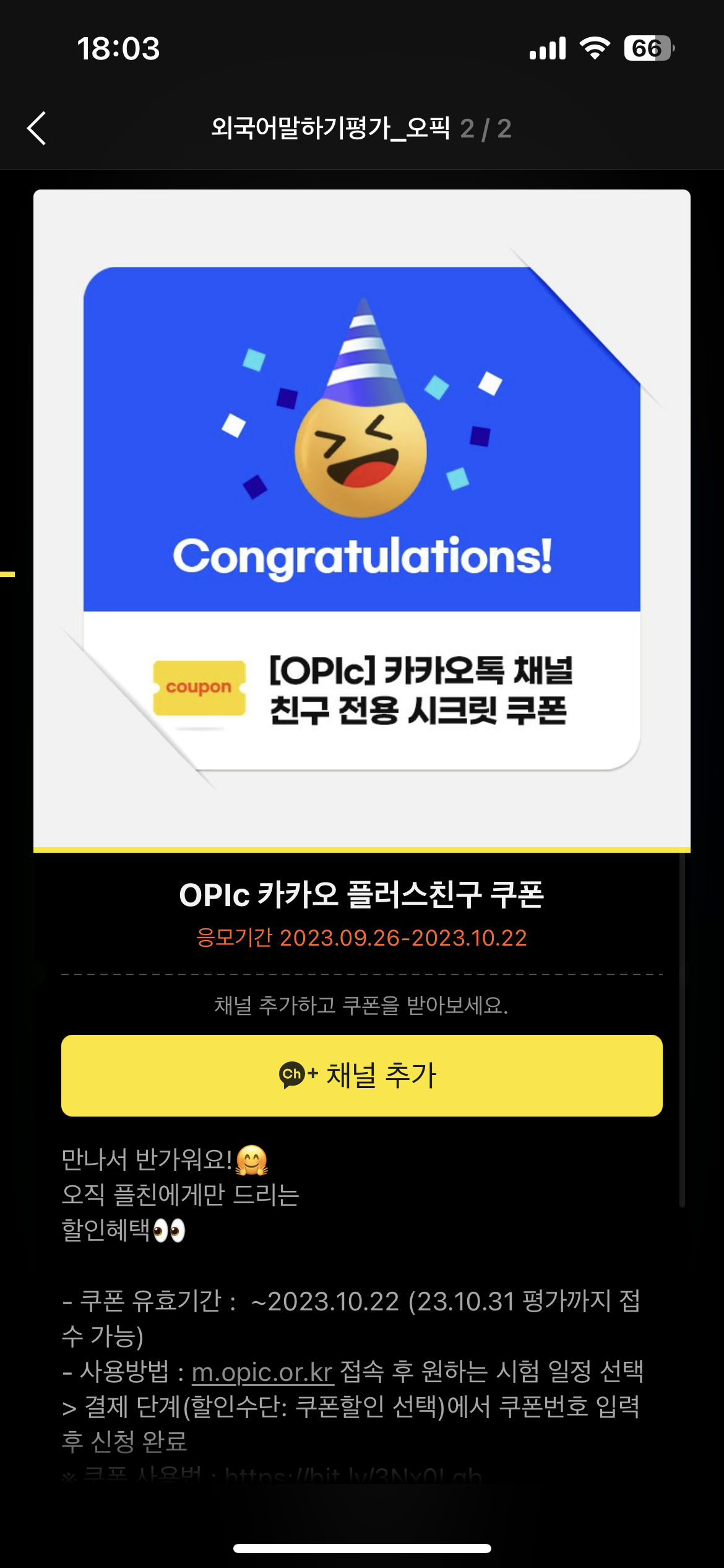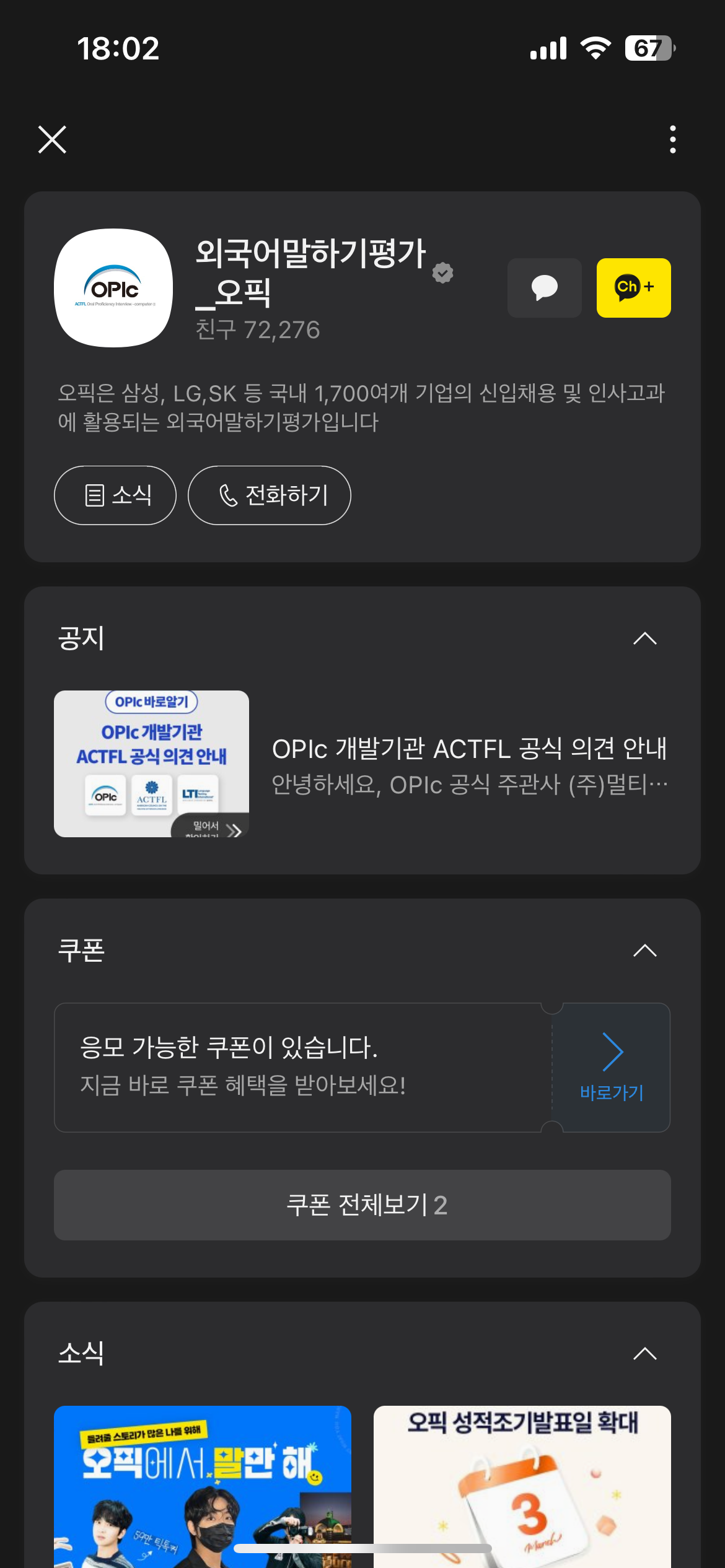하나는 OPIc 공식 카카오톡 채널을 통해서 받을 수 있고