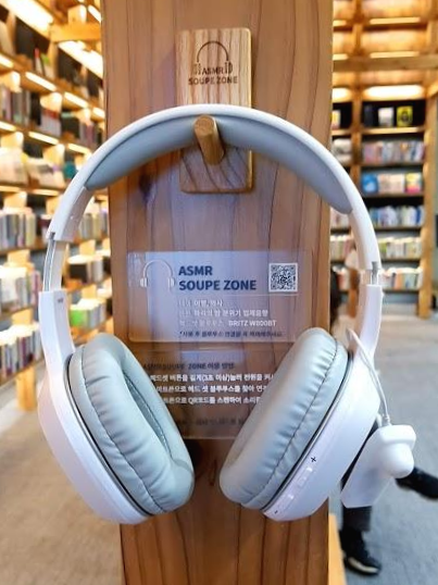 본격적으로 왼쪽의 큰 문으로 들어가면 아크앤북의 ‘북(BOOK)’. 서점을 만날 수 있다. 벽면을 따라 가득 채운 책, 의문의 육중한 목조 구조체, 노란색 귀여운 북 카트, 의외의 무대 공간 등. 의외성이 짙은 모습에 여러 번 놀라느라 눈과 귀가 바쁘다. 서점 공간 전체는 경계 없이 한 덩어리로 구성되어 자칫 소음에 취약할 수 있는데, ‘ASMR SOUPE ZONE’을 통해 온전한 독서를 선사하려고 한 아크앤북의 배려가 보였다.