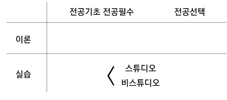 👉 학과 전체가 스튜디오 과목 중심으로 돌아가기 때문에 스튜디오에 모든 중요도가 집중되고 이론과목들의 강도와 내용이 낮은 편입니다.