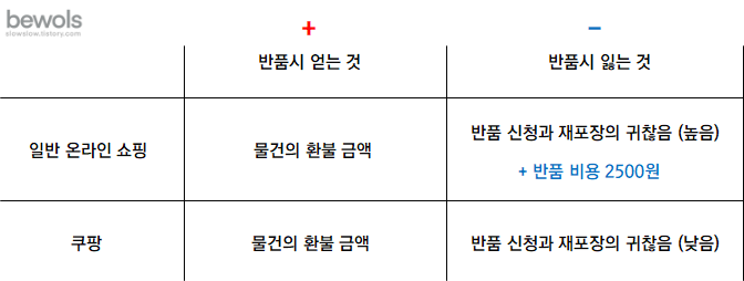 비용에는 금전적 비용과 시간, 노동 등의 비금전적 비용이 포함된다. 일반 온라인 쇼핑의 반품 시 손익과 쿠팡의 반품 시 손익을 비교하면 다음과 같다.