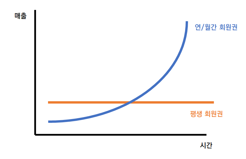 반면, 평생 회원권은 첫 1회 결제만 진행하면 추가적인 지불 필요가 없습니다. 기업 입장에서 1회만 매출이 발생하는 구조입니다. 단기적으로는 매출이 높지만, 장기적으로는 매출을 아예 기대할 수 없습니다.