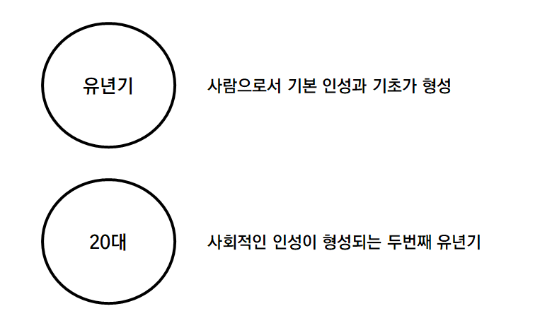 저는 유년시절만큼 20대가 중요하다고 생각합니다. 유년시절은 사람으로서 기본 인성과 기초가 형성되는 시기라면, 20대는 사회적인 인성이 형성되는 두 번째 유년시절이라고 할 수 있어요.