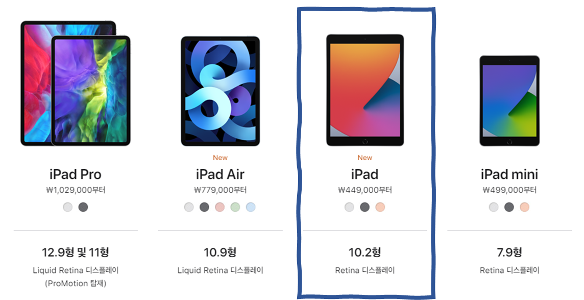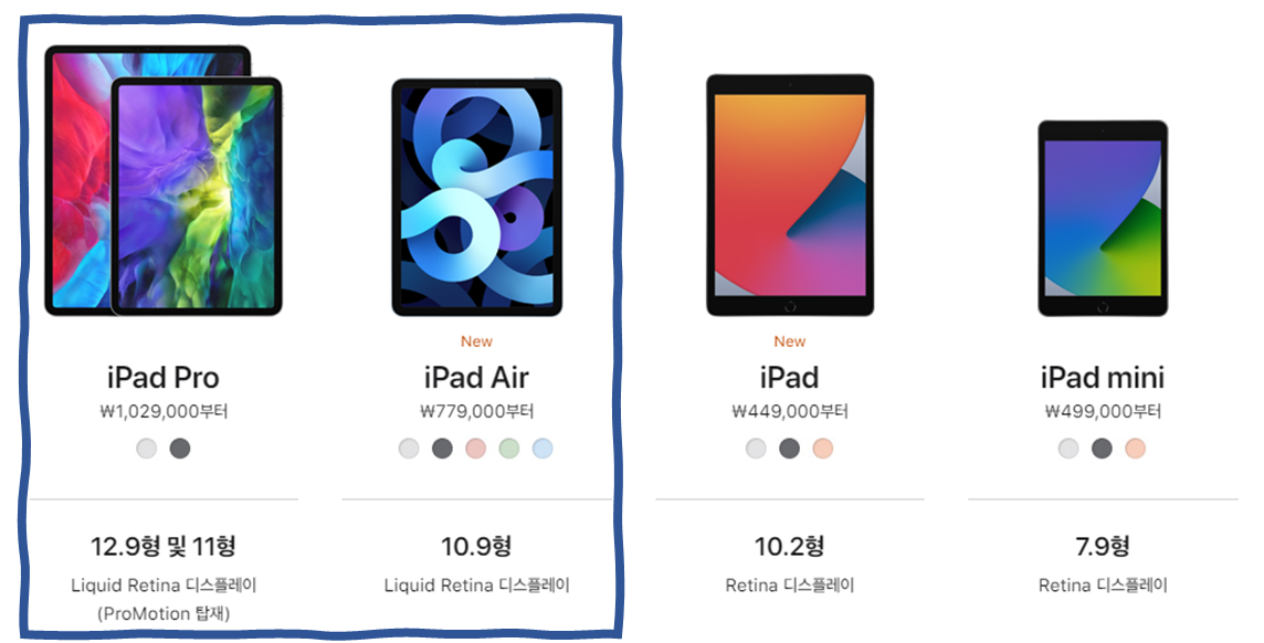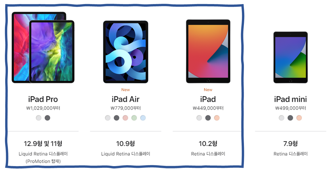 제품 : 화면이 작은 아이패드 미니를 제외한 모든 아이패드 라인업