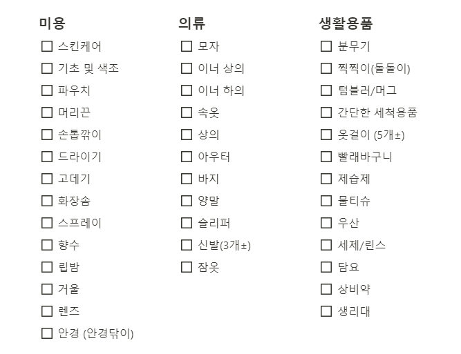 이전 글 남자 버전 기숙사 준비물 리스트에 이어서 여자버전 템플릿 공유입니다. 성별 간 큰 차이는 없으나, 생활용품 등의 일반적인 차이가 있다 보니 편의를 위해 별도로 제작했습니다.