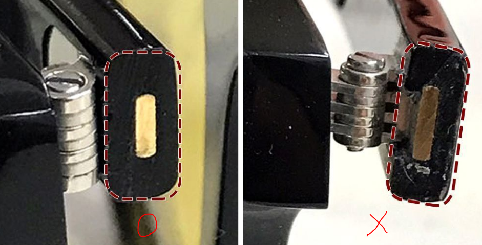 안경다리(템플)에 골격의 유무 확인이 필요합니다. 안경은 썼다 벗었다를 반복하며 안경다리와 경첩에 힘이 많이 전해집니다. 그런데 다리에 철심이 없으면 그 힘을 버텨줄 소재가 없게 되어 착용 중 파손될 가능성이 매우 높습니다.