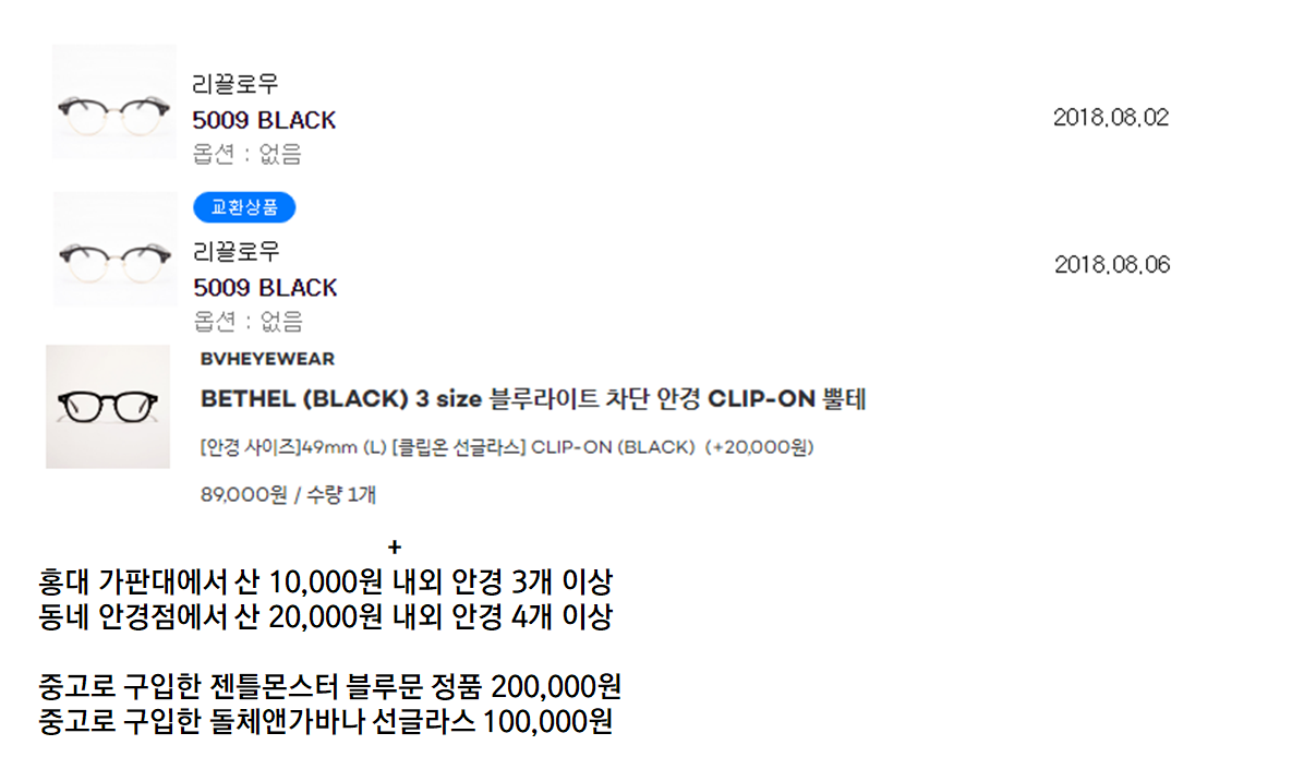 ※ 다만, 블루라이트 렌즈를 포함해서 10만 원 넘어가고 실제로 구매가는 7만 원 이렇게 되는 동글이(철테) 안경의 경우 대부분 겉모양만 복제한 '제대로 된' 안경이 아닌 경우가 많습니다. 완성도 내구성 등의 다양한 문제가 발생할 수 있습니다.