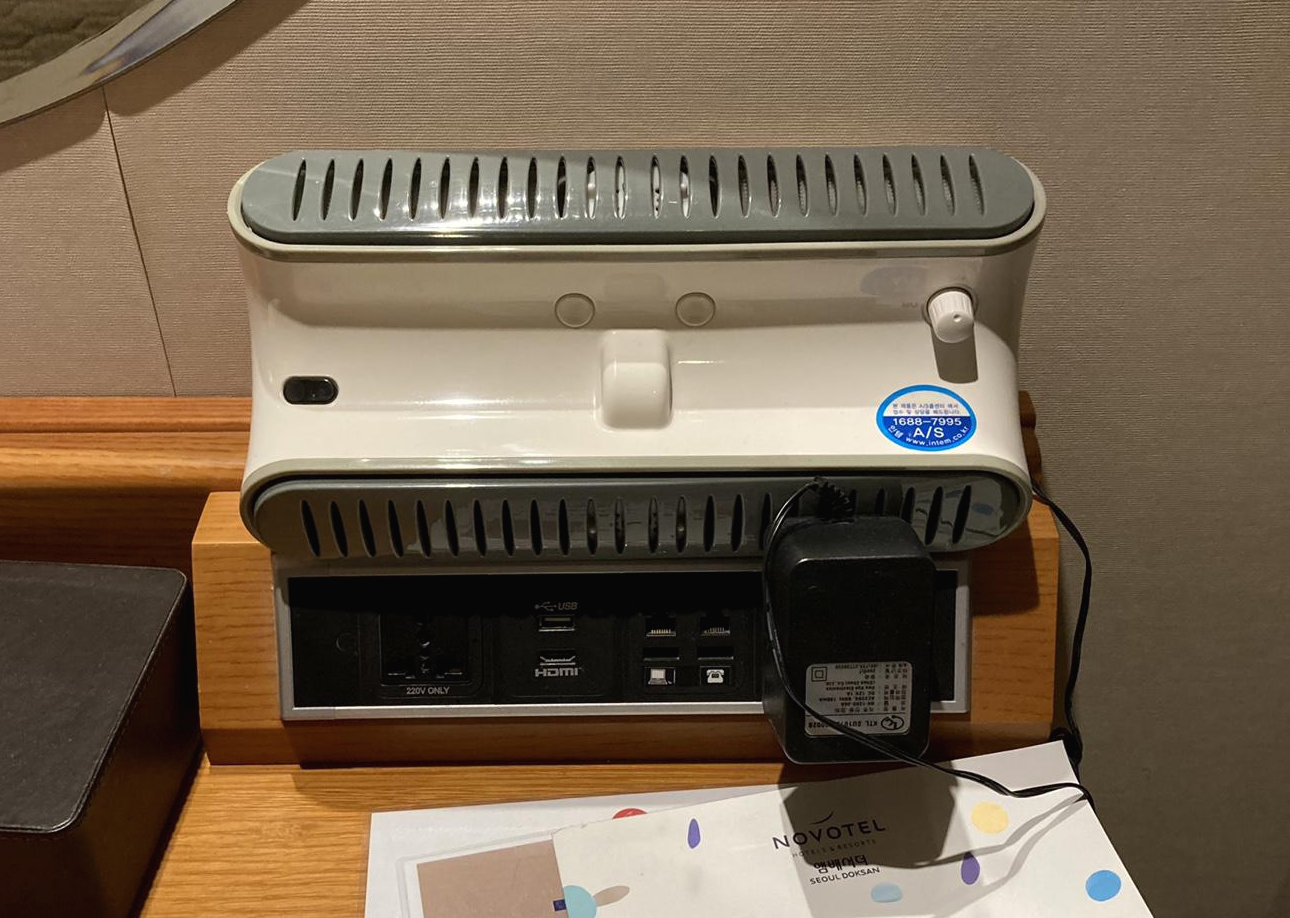 TV 선반 옆 의문의 기계가 있었습니다. 흡기구와 배기구가 있고 풍속 조절을 할 수 있는 것으로 보아 공기청정기가 아닐까 추측했지만 형태도 독특하고 그 이름이 적혀있지 않아 존재 자체와 사용법 모두 정확히 알 수 없었습니다.