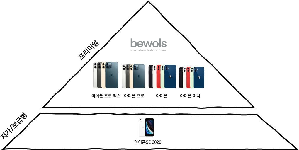 이는 두 라인업의 모두의 프리미엄 이미지 형성을 위함일 것이다. 아이폰 미니가 추가되면서 아이폰 SE2020, 아이폰 기본라인, 아이폰 프로라인 간의 위치를 결정해줘야 했다. 기존의 아이폰 SE2020이 확실한 중급의 레밸을 가지고 있었기 때문에, 아이폰 기본라인의 캐주얼 이미지를 삭제하면서 프리미엄 화 시키고, 프로라인은 그보다 더 상급으로 만드는 전략을 취했다.