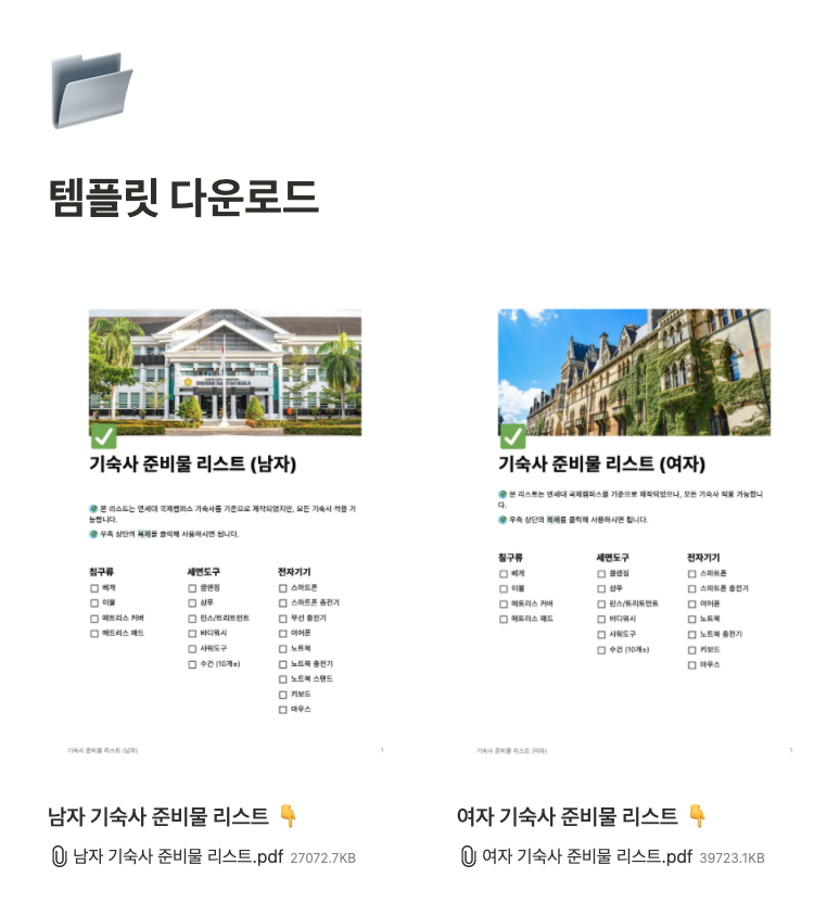 지난 포스팅에서 Notion 페이지로 공유드렸던 대학교 기숙사 준비물 리스트를 PDF 파일로 변환해 양식 공유드립니다.