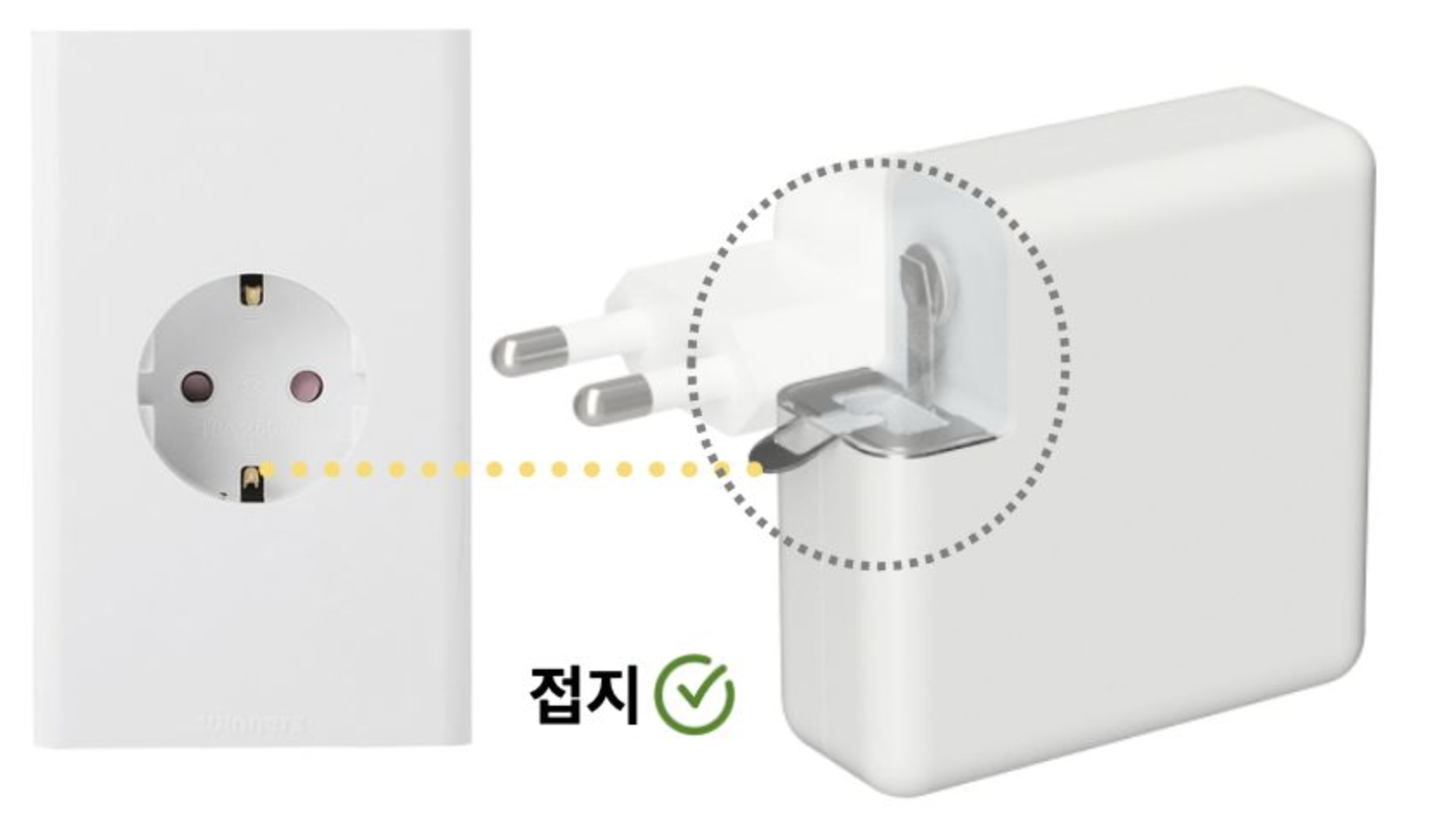 두들 플러그 장착 시 맥북 어댑터의 디자인이 아주 살짝 바뀌지만, 안정감 있는 접지가 가능하다는 게 장점이에요. 출시된 지 오래돼서 이미 공인된 제품이라는 점도 큰 장점이고요.