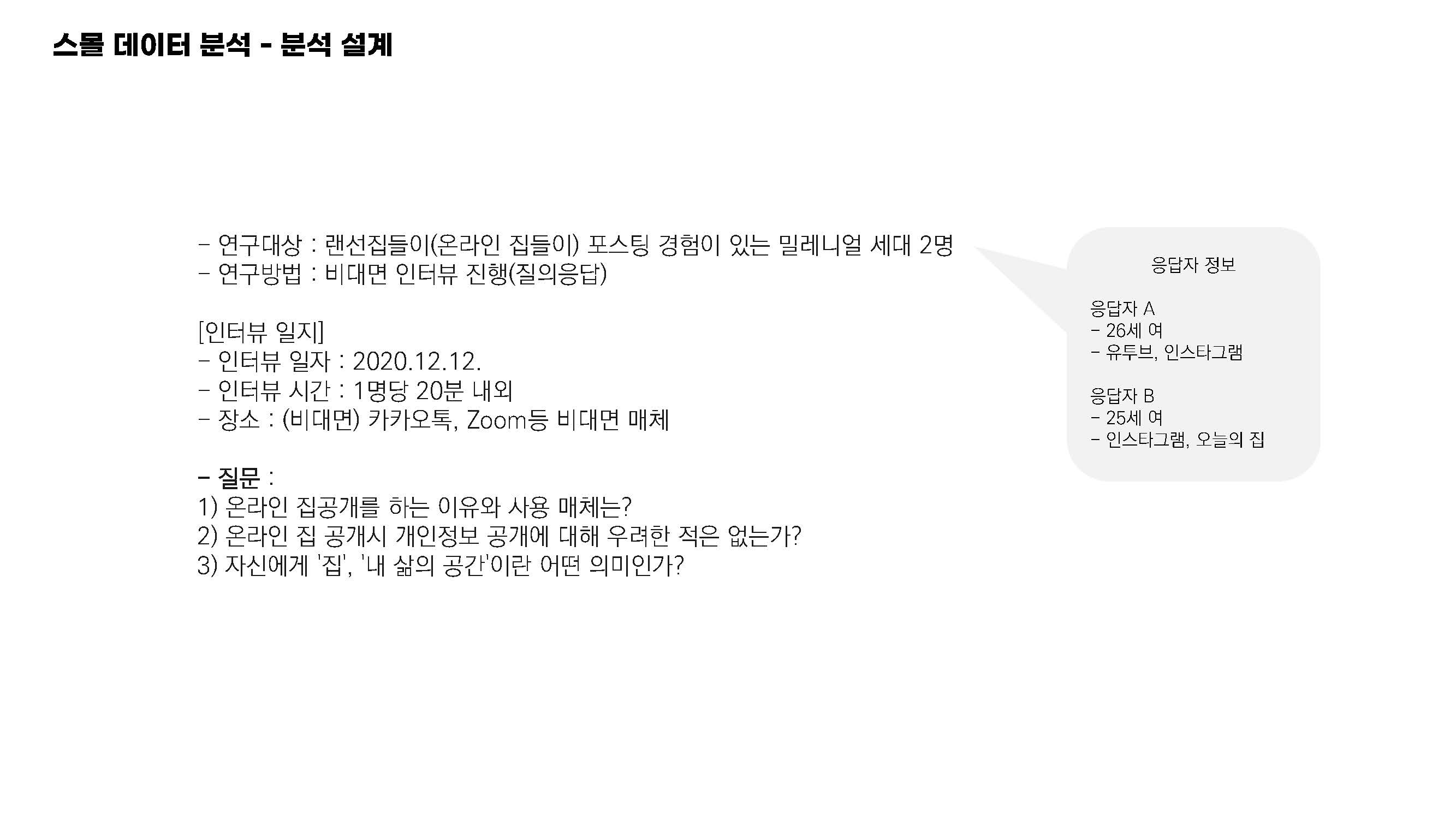 유튜브, 오늘의 집 등 관련 채널에 랜선 집들이 관련 온라인 포스팅 경험이 있는 밀레니얼 세대 2인을 인터뷰 대상으로 설정했으며