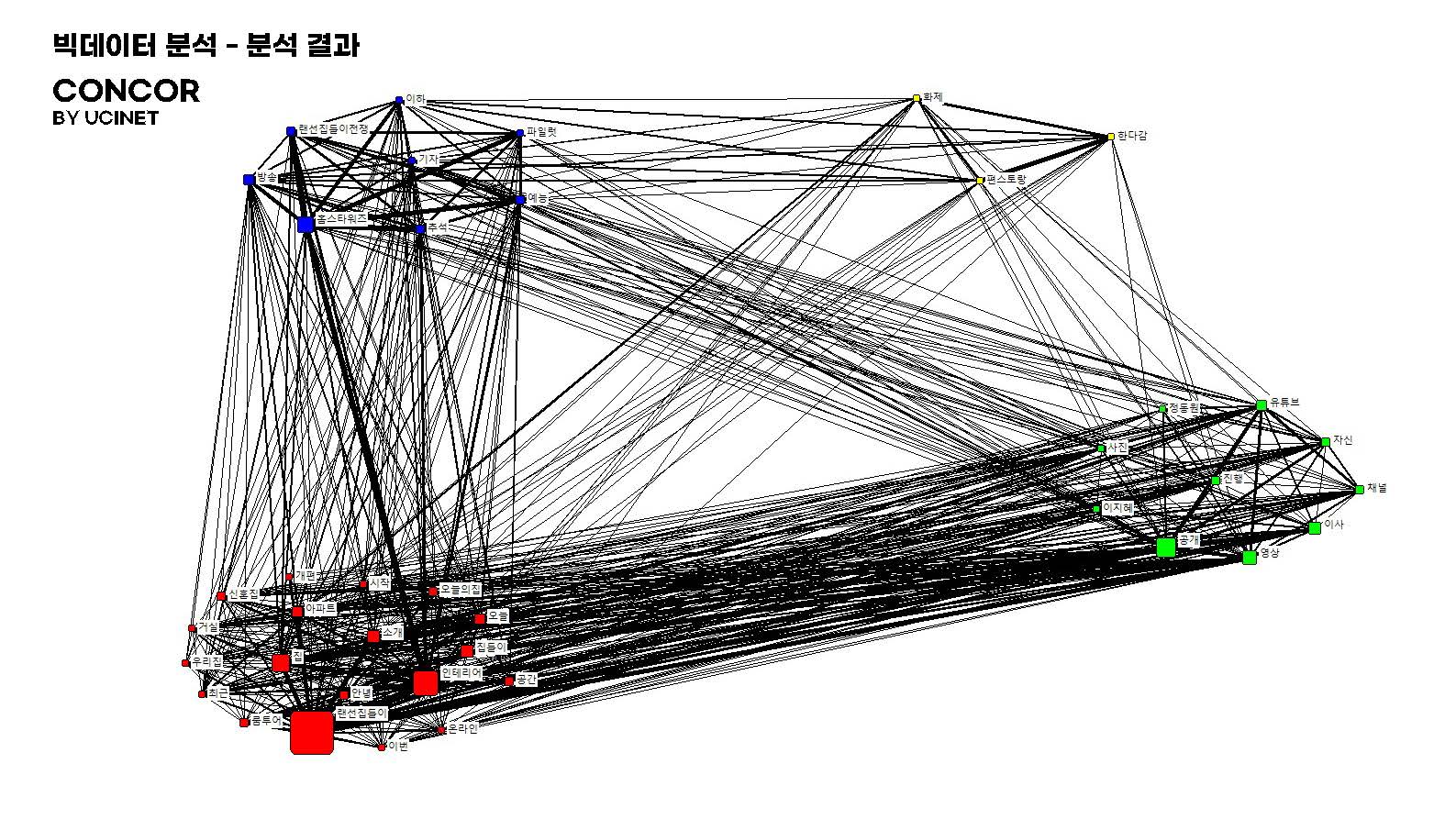먼저, 붉은 집단은 랜선 집들이, 인테리어, 집들이, 오늘의 집 등 랜선 집들이 랜선 집들이와 관련된 소재, 방법 등의 단어가 나타나 랜선 집들이를 보여주는 전반적인 단어의 집합으로 볼 수 있었고,