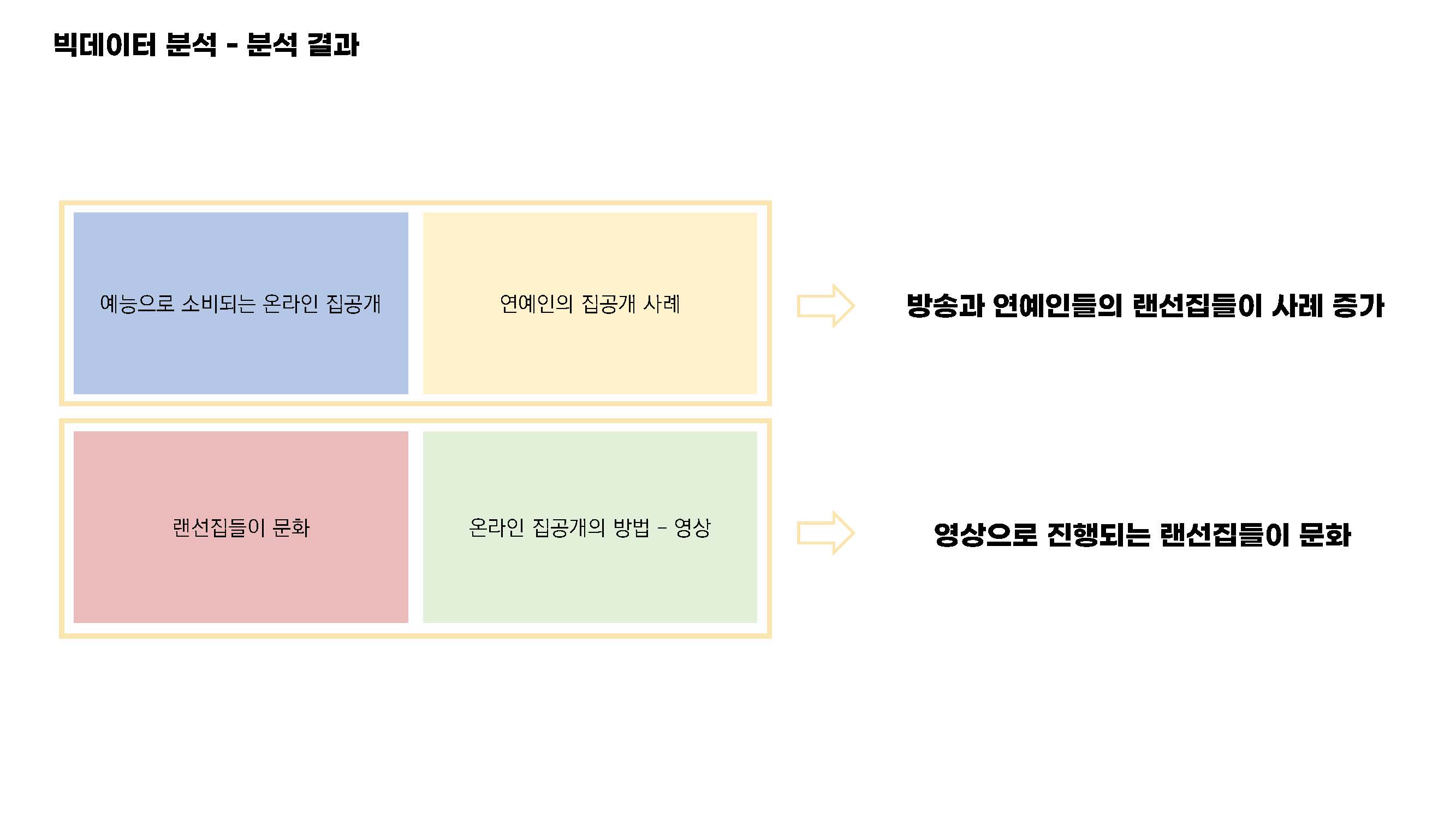 4가지 집단을 다시 간략하게 정리하면, 내용 유사도와유사도와 네트워크 간 연결관계를 통해 파랑 노랑 / 빨강 초록 두 개의 집단으로 나눌 수 있었으며 각각 방송과 연예인들의 랜선 집들이 사례 증가와 영상으로 진행되는 랜선 집들이 문화로 나눌 수 있었습니다.