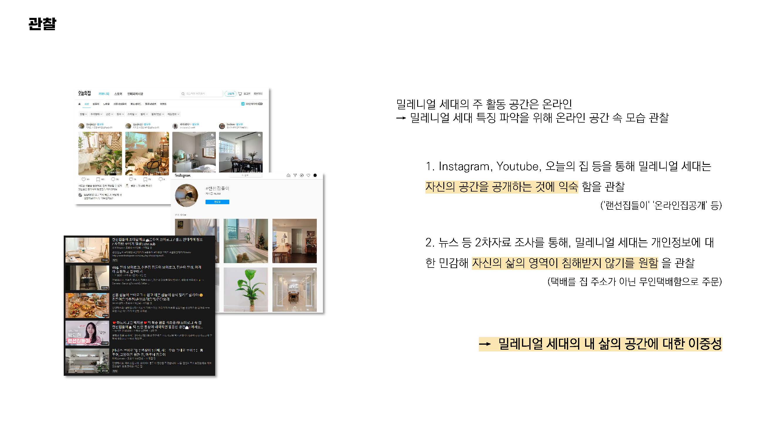 다양한 SNS 중 오늘의 집, 유튜브, 인스타그램을 통해 밀레니얼 세대들은 '랜선 집들이'와 같은 키워드로 자신의 공간을 공개하는 것에 익숙하다는 것을 관찰했습니다.