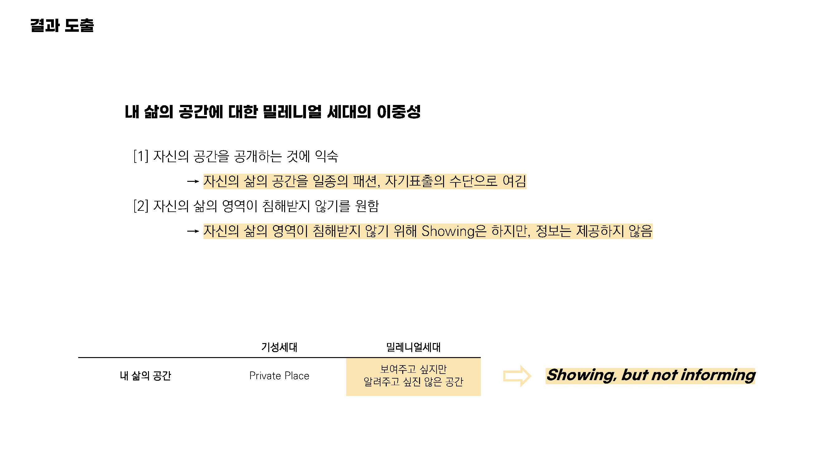 이러한 두 가지 모습을 통해서 밀레니얼 세대는 내 삶의 공간과 공개라는 측면에서 이중성을 보인다는 점을 알게 되었습니다.
