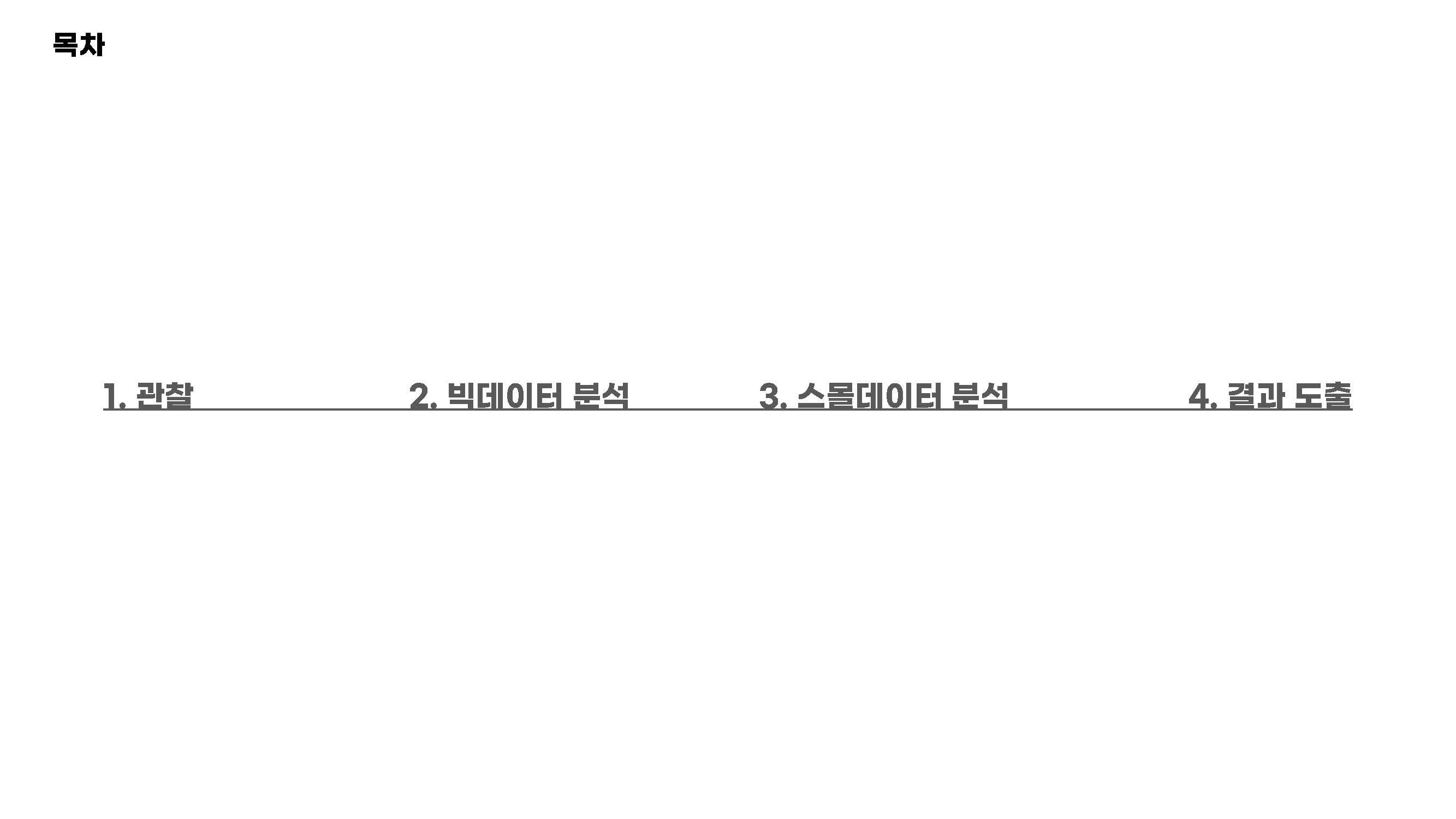 크게 네 가지 단계로 관찰 > 빅데이터 분석 > 스몰데이터 분석 > 결과 도출의 흐름으로 발표를 구성했습니다.
