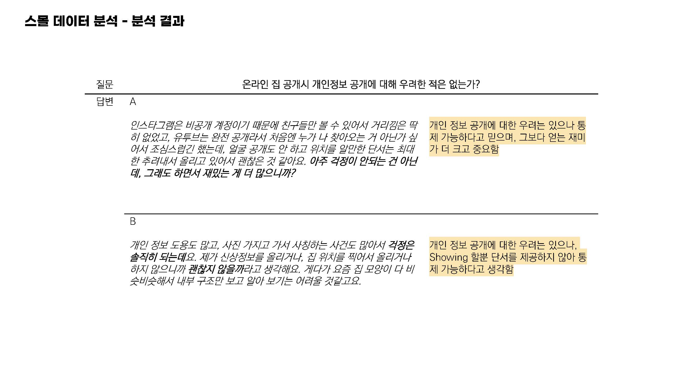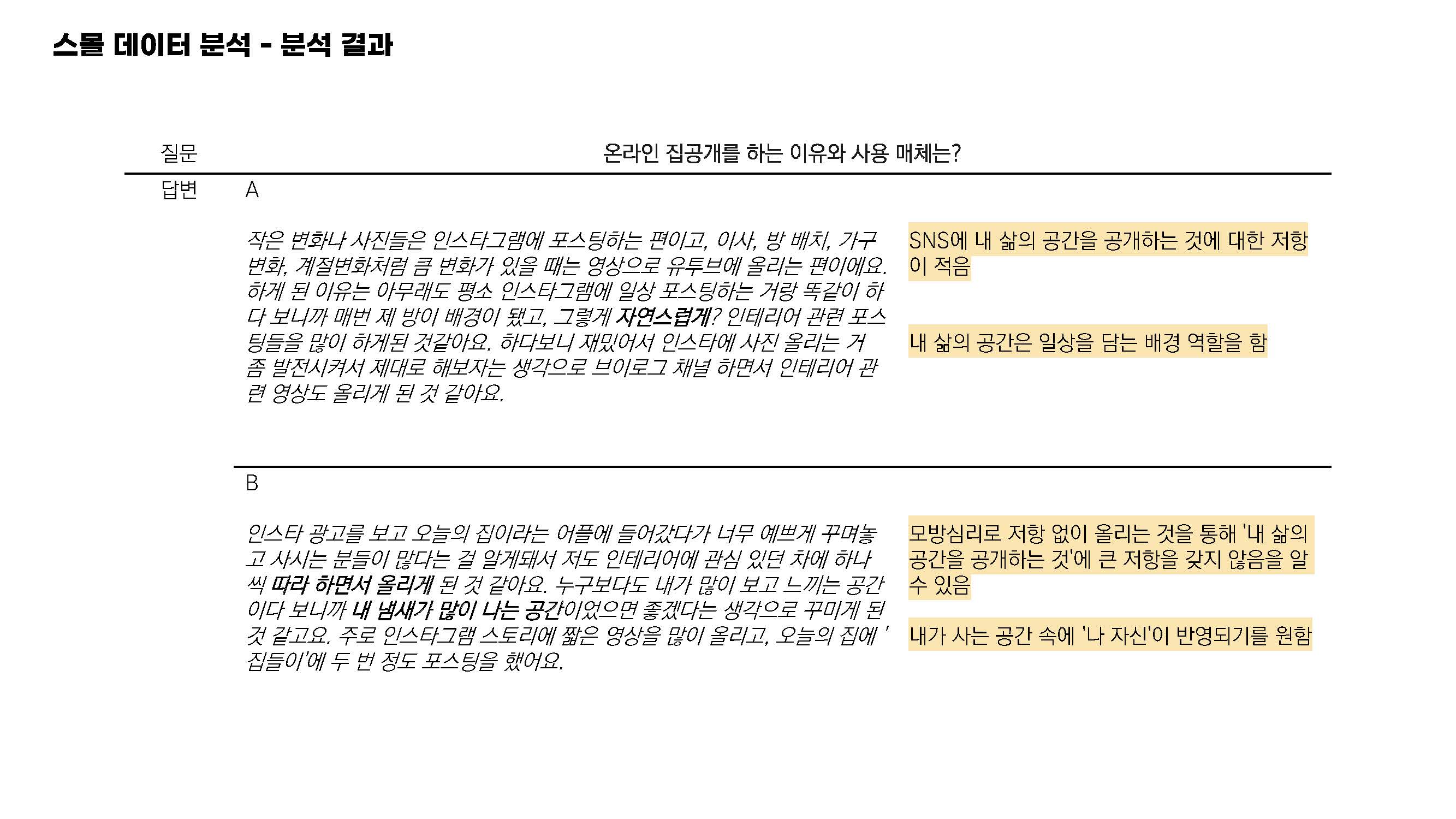 응답자 A, B 모두 SNS에 내삶의 공간을 공개하는 것에 대한 저항이 적음을 알 수 있었고 내 냄새가 많이 나는 공간으로 꾸미고 싶다 라는 응답을 통해 내가 사는 공간 속에 나 자신이 반영되기를 원함을 알 수 있었습니다.