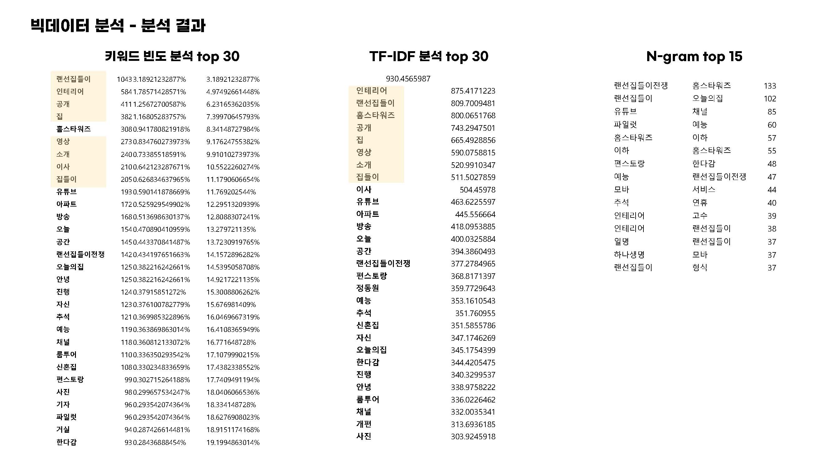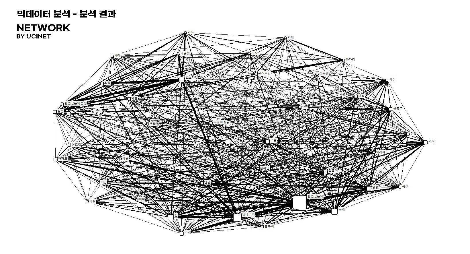 키워드 빈도 분석 결과 중심 키워드인 랜선 집들이를 비롯한 인테리어, 공개, 집, 영상, 소개 등 집 공개 방식이나 관련 키워드들이 높은 빈도와 중요성을 갖는 것을 알 수 있었습니다.