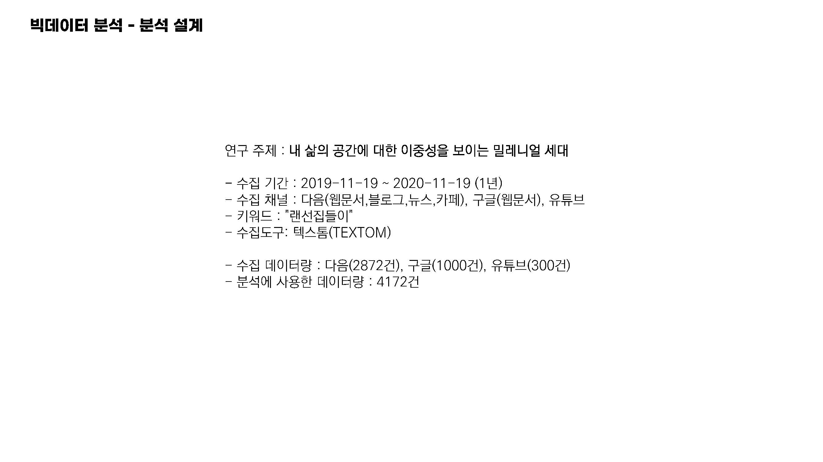 분석 설계단계에서 연구 주제를 "내 삶의 공간에 대한 이중성을 보이는 밀레니얼 세대"로 설정하였습니다.