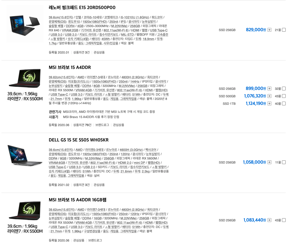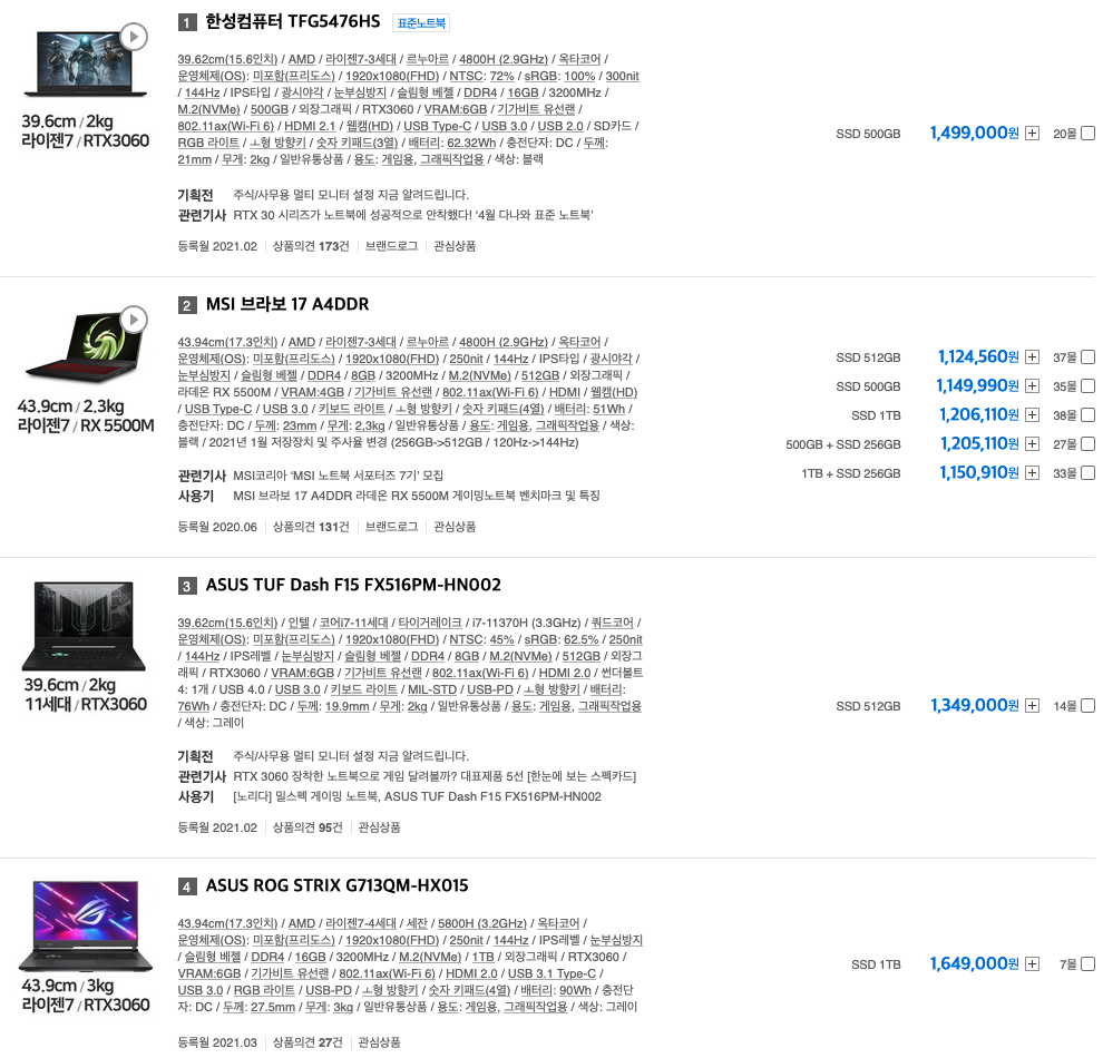 위 조건들을 만족시키는 노트북을 다나와에서 찾아보면