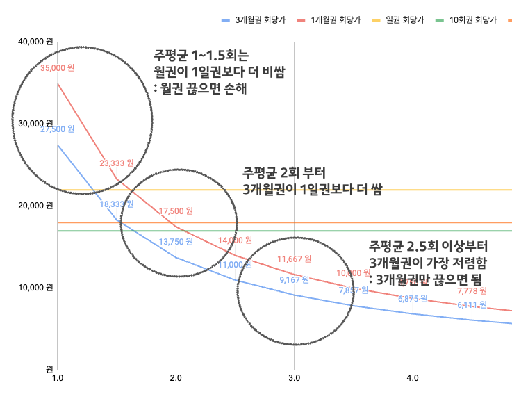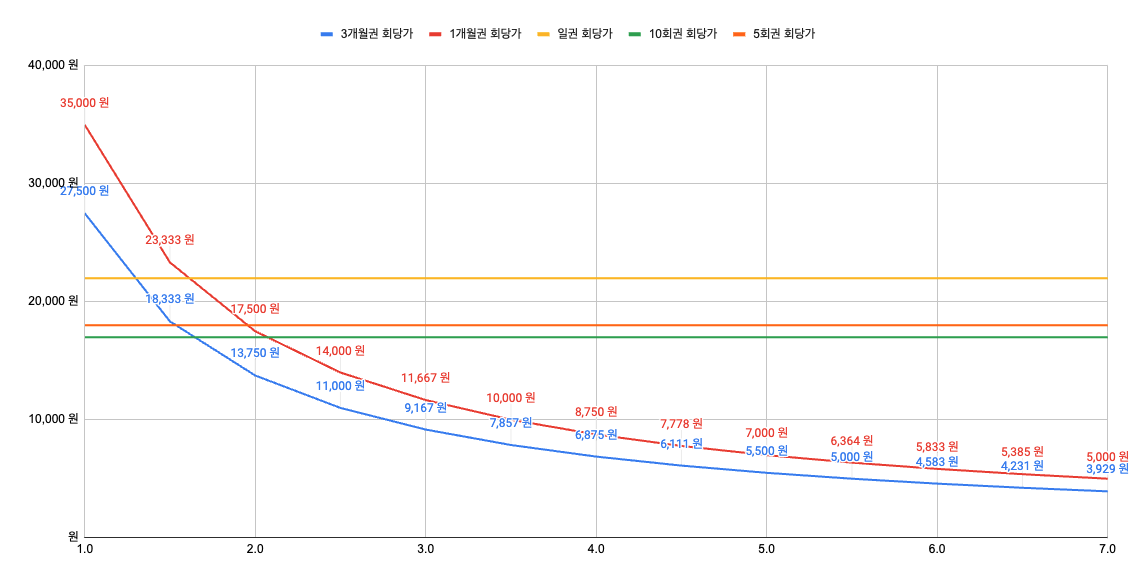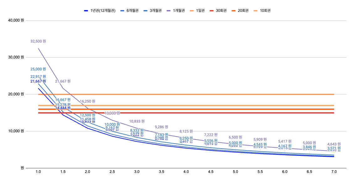 - 1개월권 을 제외하면 모든 월권이 횟수권 보다 저렴해지는 시점.