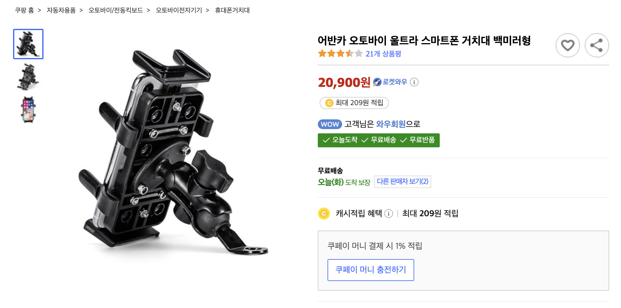쿠팡에는 수많은 알리발 - 가품 램마운트가 있습니다. 이 중에서, 가장 접근성이 좋은 2만 원대 (반품 상품 구매 시 1.7까지도 가능) 핸드폰 거치대를 구매해 보았습니다.